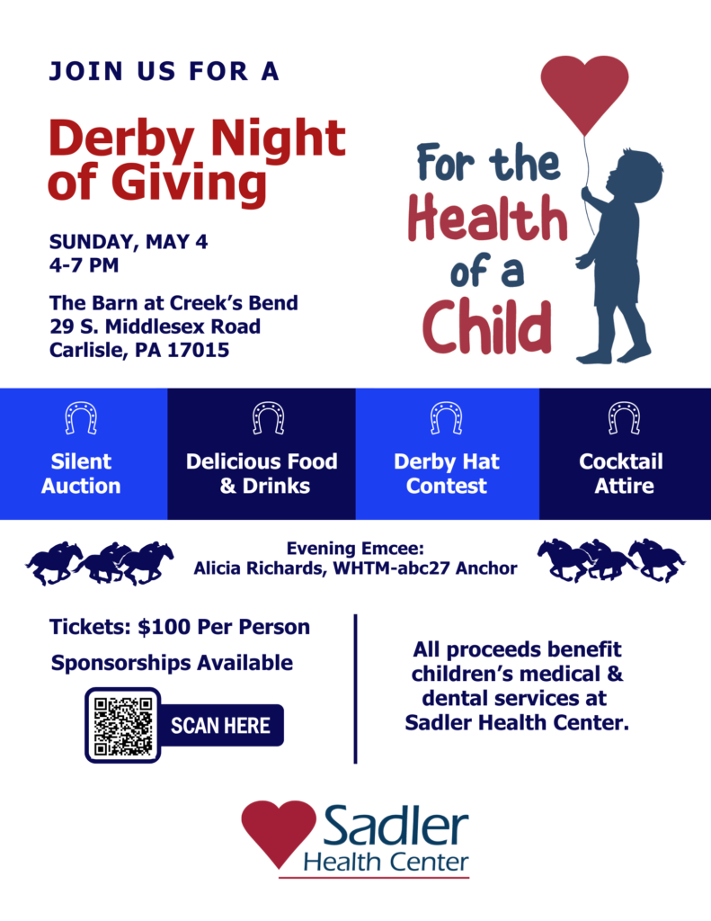 CARLISLE, Pa. (April 9, 2025) – Sadler Health Center is excited to host a “Derby Night of Giving” to support its medical and dental services for local children.