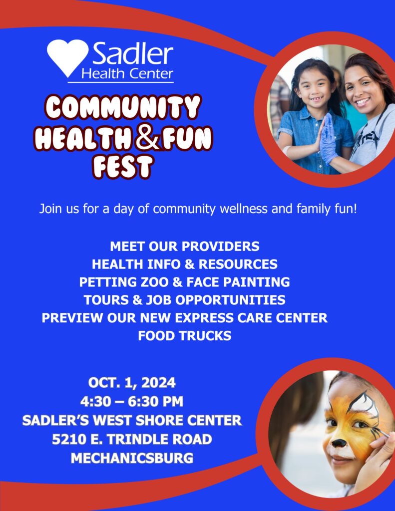 మెకానిక్స్ బర్గ్, పా. (సెప్టెంబర్ 20, 2024) – శాడ్లర్ హెల్త్ సెంటర్ అక్టోబర్ 1, మంగళవారం సాయంత్రం 4:30-6:30 గంటల వరకు మెకానిక్స్ బర్గ్ లోని 5210 ఇ. ట్రిండిల్ రోడ్ లోని తన వెస్ట్ షోర్ సెంటర్ లో కమ్యూనిటీ హెల్త్ & ఫన్ ఫెస్ట్ ను నిర్వహిస్తుంది. అక్టోబర్ 14 న సాడ్లర్ యొక్క కొత్త ఎక్స్ప్రెస్ కేర్ వాక్-ఇన్ క్లినిక్ ప్రారంభం యొక్క ప్రత్యేక ప్రివ్యూతో సహా ఈ కార్యక్రమం కమ్యూనిటీ వెల్నెస్ మరియు కుటుంబ వినోదం యొక్క రోజుగా పరిగణించబడుతుంది.